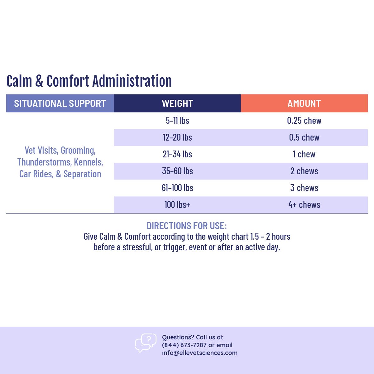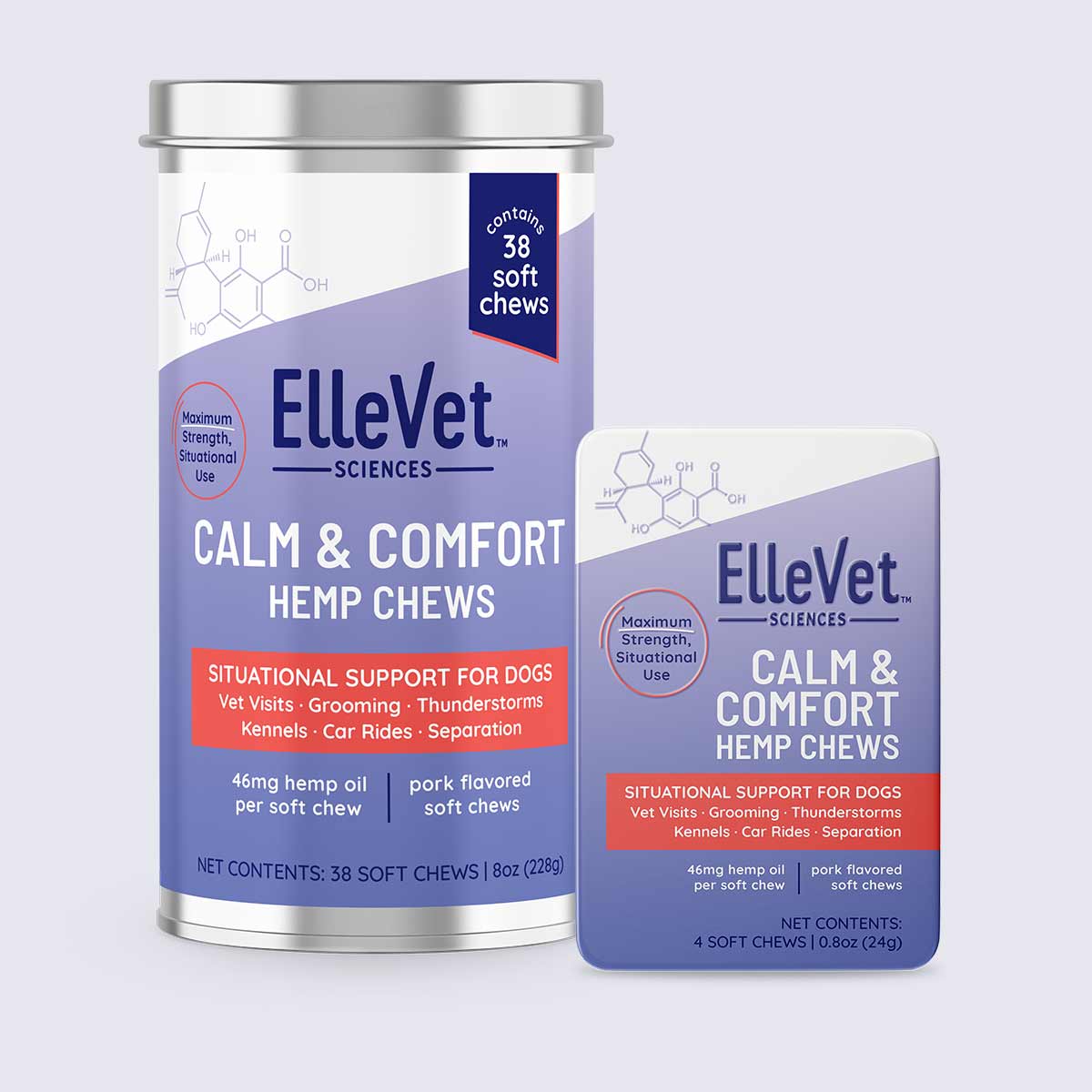 Unlike ElleVet’s other products, which are designed to be a part of your dog’s daily regimen, Calm & Comfort is a situational-use chew meant for times when they need some extra support. Calm & Comfort can be used in addition to your dog’s daily ElleVet, and is a great choice to have on hand for occasions like vet visits, fireworks, and thunderstorms.