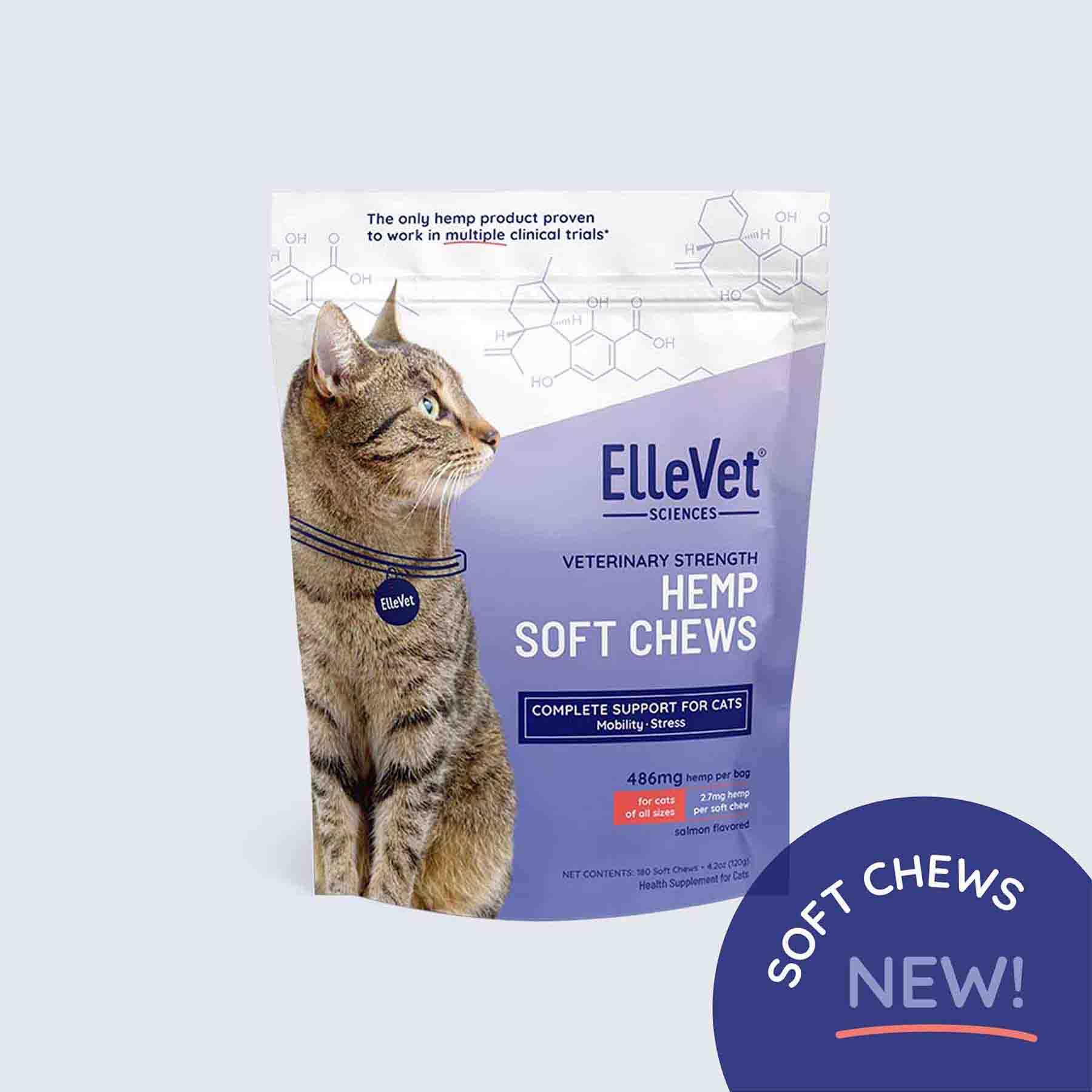 ElleVet soft chews are salmon-flavored and specifically formulated for cats. The Soft Chews can be easily administered at mealtime, either whole or crumbled, which is the preferred method for many pet owners. They contain the same complete spectrum hemp oil that is in our other products.