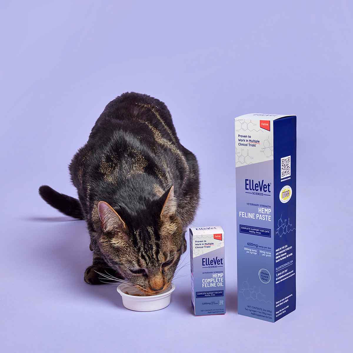 All of ElleVet’s products contain the same safe and effective Complete Spectrum Proprietary Hemp Oil. The formulation of our Oil products for cats and dogs are identical, while our Feline Paste is formulated specifically for cats. Through our research, we have learned that cats need a higher amount of hemp extract per kg of body weight than dogs because they don’t absorb it quite as well as dogs. The administration tables on our Feline products reflect this higher amount to ensure cats get the support they need.